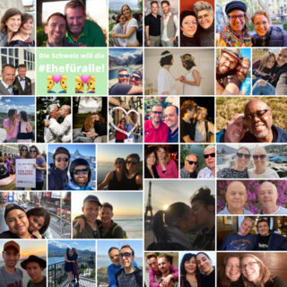 Une semaine avant que le mariage pour toutes et tous ne soit traité pour la première fois au Conseil national, nous avons lancé notre campagne "la Suisse veut le mariage pour toutes et tous" pour faire pression sur les membres du Conseil national. Plus de 80 couples de la communauté ont répondu à notre appel et nous ont fourni une photo avec une déclaration en faveur du mariage pour toutes et tous. Le résultat : un énorme collage avec des photos de couples qui font chaud au cœur et des revendications claires pour le mariage pour toutes et tous !